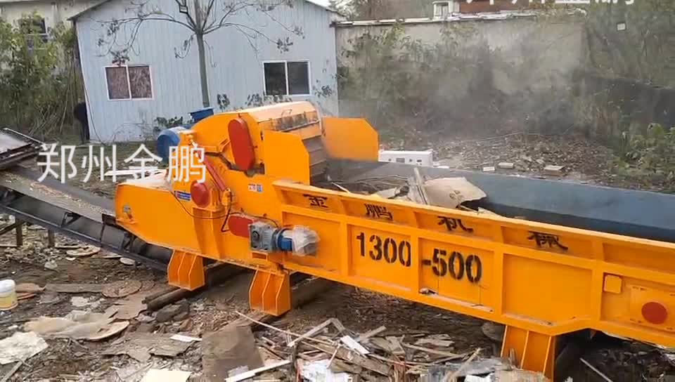 木材綜合破碎機(jī)工作時(shí),由電機(jī)帶動(dòng)轉(zhuǎn)子進(jìn)行高速旋轉(zhuǎn),同時(shí)進(jìn)料斗也在電機(jī)的帶動(dòng)下進(jìn)行緩慢的旋轉(zhuǎn),物料經(jīng)抓機(jī)投放進(jìn)料斗,料斗在旋轉(zhuǎn)的同時(shí)內(nèi)壁上的撥料齒會(huì)將物料均勻的撥到轉(zhuǎn)子上,高速旋轉(zhuǎn)的轉(zhuǎn)子碰到物料經(jīng)由轉(zhuǎn)子上刀片的切削和撕扯實(shí)現(xiàn)物料的初步破碎,進(jìn)過(guò)初步破碎的物料無(wú)在自身重力和轉(zhuǎn)子沖擊力的作用下掉在破碎腔內(nèi)的篩網(wǎng)上,符合要求的物料會(huì)通過(guò)篩網(wǎng)排出,而不符合要求的會(huì)在破碎腔內(nèi)進(jìn)行二次甚至三次的破碎加工直至符合要求。